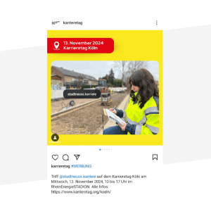Unsere Social Media-Experten erstellen in Absprache mit Ihnen Ihre ganz persönlichen Facebook- und Instagram-Posts. In diese Posts binden wir neben dem Text gern Ihr Logo, Bilder oder Videos ein. Natürlich wird auch Ihre Website und Ihre Facebook- bzw. Instagram-Seite verlinkt. Die Posts erscheinen ab 10 Tage vor der Jobmesse auf unseren Kanälen.