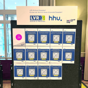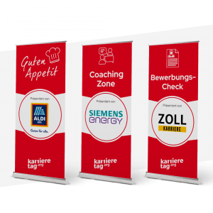 Prominente Platzierung eines Roll-Up Displays (Größe ca. 85x220cm) im Eingangsbereich des Karrieretags. Ggf. abhängig von den örtlichen Gegebenheiten alternativ an einer anderen zentralen Stelle auf der Messefläche.