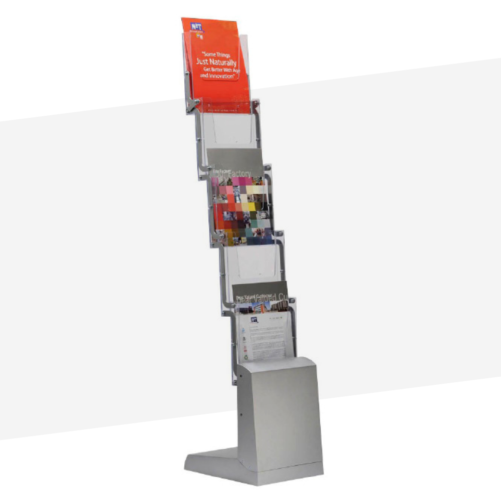 Praktischer und platzsparender Prospektständer für übersichtliche und gut zugängliche Präsentation von Flyern, Broschüren und Infomaterial an Ihrem Messestand.