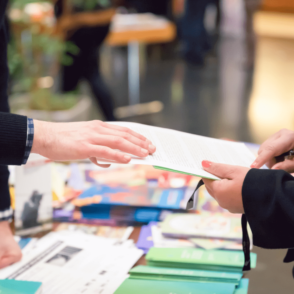 Mit der Lizenz dürfen Sie Flyer auf den allgemeinen Flächen der Messe verteilen – z. B. im Eingangsbereich, in den Gängen oder im Besucher-Café.