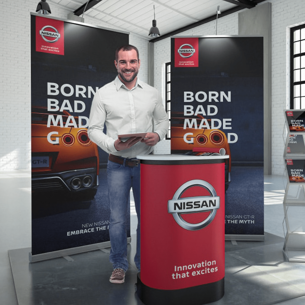 Mobiler Messeauftritt mit zwei vollflächig bedruckbaren Roll-Ups, praktischer Messetheke und Prospektständer. Schnell aufgebaut und transportiert – ganz ohne Werkzeug. Ideal für kleine Stände oder als Ergänzung großer Aufbauten.
