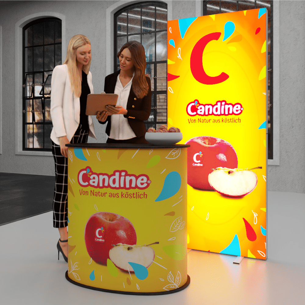 Praktische Theke mit Ablagefächern kombiniert mit modernem LED Roll-Up. Werkzeugloser Aufbau in Minuten dank hochwertigem Aluminium-Stecksystem. Vollflächig bedrucktes Textilbanner mit LED-Beleuchtung sorgt für Aufmerksamkeit. Perfekt für kleine Stände oder als Ergänzung großer Aufbauten.