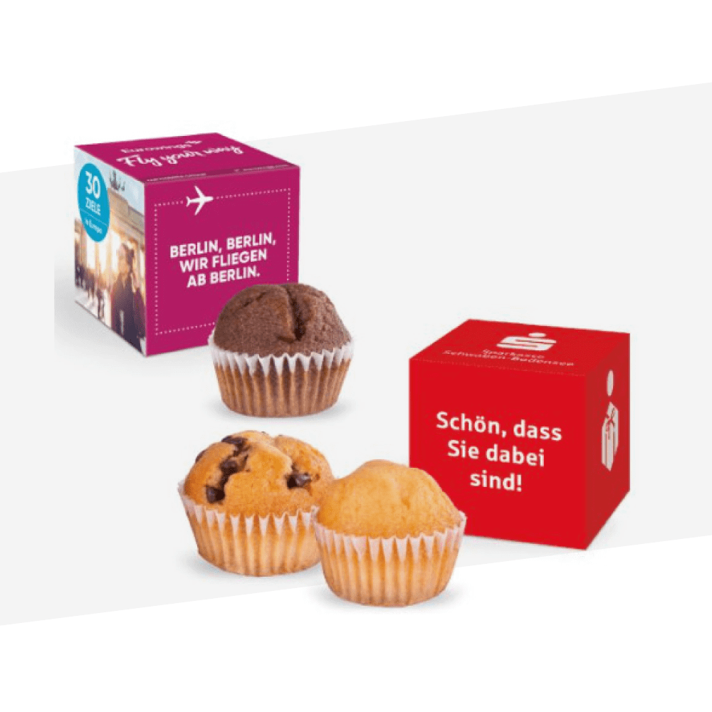 Unser sympathisches Maskottchen verteilt Werbegeschenke in Ihrem Namen und sorgt so für maximale Aufmerksamkeit. Die Verpackung der Mini-Muffins wird individuell in Ihrem Unternehmensdesign gestaltet – für einen bleibenden, sympathischen Eindruck bei den Besuchern.