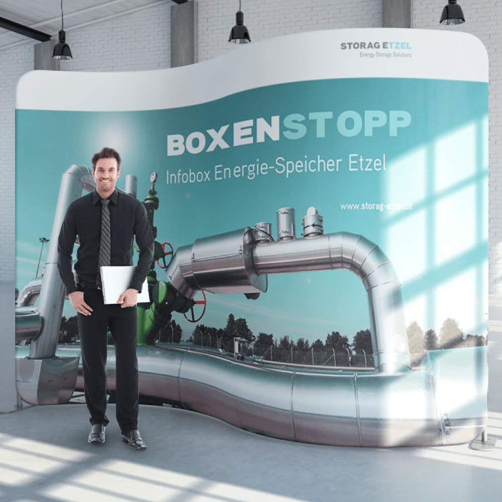 Wellenförmige Rückwand London Dynamisches Design für eine moderne und einladende Messestand-Optik. Setzt Akzente und präsentiert Ihre Botschaft wirkungsvoll.