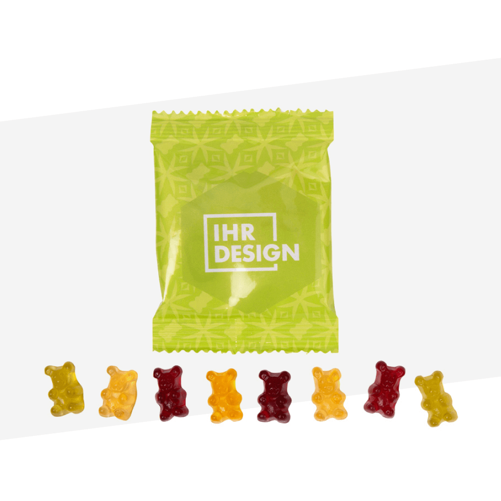 Unser Maskottchen Berry verteilt Ihre veganen Gummibärchen direkt an die Besucher – charmant, aufmerksamkeitsstark und in Ihrem Namen. Die beidseitig bedruckbare Verpackung wird individuell in Ihrem Unternehmensdesign gestaltet – für einen bleibenden Eindruck mit einem Augenzwinkern.