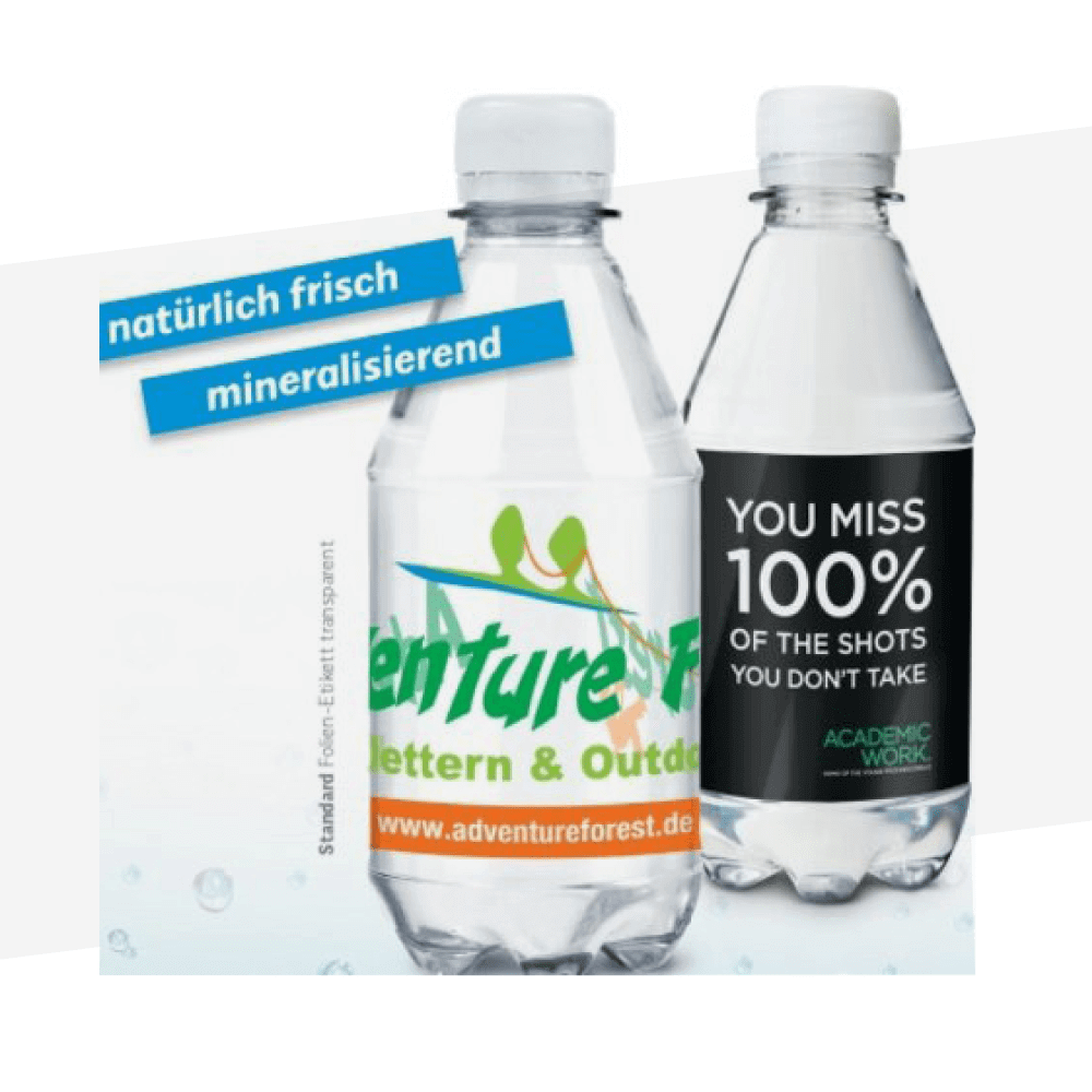 Unser Karrieretag-Maskottchen Berry verteilt in Ihrem Namen Wasserflaschen – charmant, auffällig und wirkungsvoll. Das Papier-Etikett wird individuell in Ihrem Unternehmensdesign gedruckt. Enthalten ist natürliches Mineralwasser aus dem Nationalpark Hunsrück-Hochwald in einer PET-Flasche mit weißem Schraubverschluss inkl. Pfand.